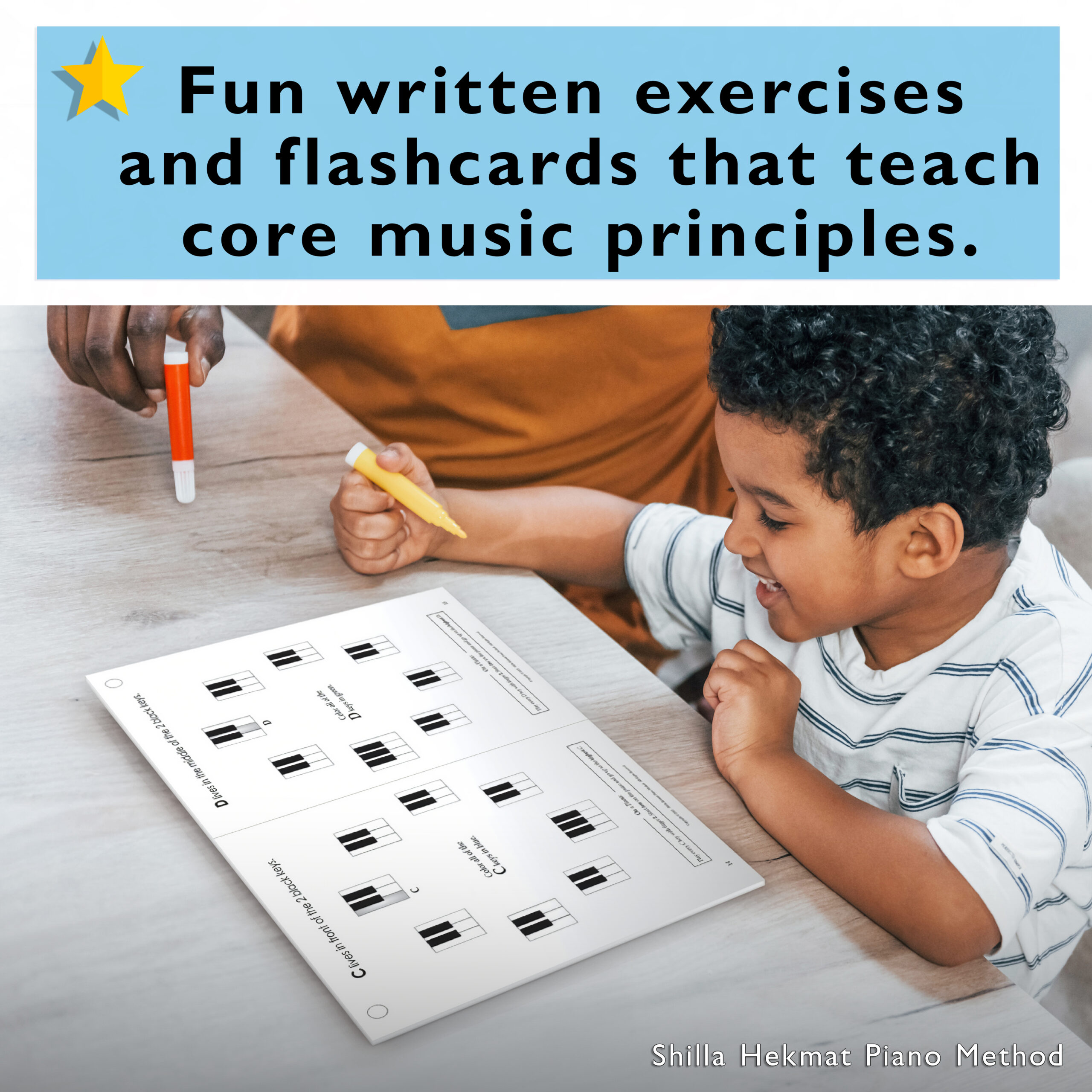 - Piano Theory – A companion exercise book that teaches key music theory principles, reinforced through fun activities and flashcards to make learning interactive and memorable.